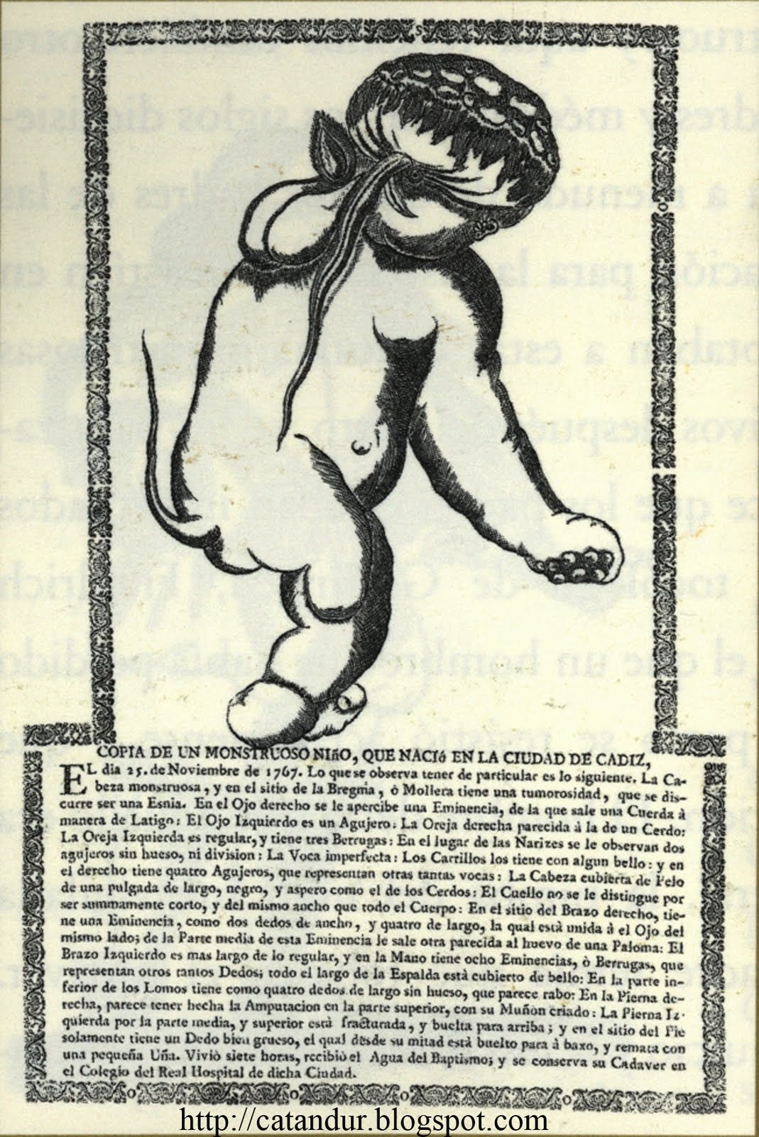 Las leyendas sobre seres monstruosos son constantes desde el inicio de los tiempo. Demonios y seres mitólogicos que se convertían en realidad en la mente de los supersticiosos e incautos. Pero nada producía más miedo que el monstruo humano. Y el miedo por el nacimiento del niño debió extenderse en la ciudad como un reguero de polvora. Aún hoy, leyendo la descripción de la criatura, una sensación extraña recorre mí cuerpo. Pero, en este repaso a las leyendas y sucesos de Cádiz no quiero dejar de hablar del monstruoso niño que nació en Cádiz el día 25 noviembre de 1767 y cuya descripción, tal vez realizad por el propio médico que atendió el parto, ha llegado hasta nosotros en una lámina anónima de fines del s. XVIII: