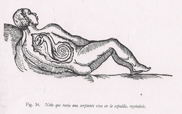 Ambroise Pare (1509-1590), hombre del Renacimiento, autodidacta y cirujano curtido en los campos de batalla además de médico de varios reyes y miembro del Colegio de San Cosme, publicó en 1575 su libro de monstruos humanos y animales, de falsos mendigos y curiosidades celestes. En el que habla de mujeres que “arrojaban por la nariz serpientes y otros animales cosa que puede ocurrir” argumenta “por la corrupción de ciertos alimentos comidos”. Y nos habla de diferentes casos de animales nacidos -o expulsados habría que decir- de mujer. Casos que pone en boca de otros estudiosos como Levinus o Lycosthenes, quién dice que en 1494 nació en Cracovia, en la plaza del Espíritu Santo, un niño muerto con una serpiente viva aferrada a la espalda, que devoraba para alimentarse.Y puede que se pregunten el por qué de esta entrada enmarcada en Leyendas de Cádiz. Y la respuesta la encontramos en la Cantiga 368 de Alfonso X el Sabio. En ella se cuenta como Santa María del Puerto curó a una mujer que llevaba una culebra en el vientre desde tres años antes. La mujer, que vivía en Córdoba, junto a Santa María la Grande, pensaba que tenía una cobra en su interior y fue a Castilla buscando una solución. En sueños tuvo una visión que le dijo “cometes una locura al no ir a Silos, donde nos habitamos pues fuimos su abad”. Y la mujer cambió su destino y marchó al monasterio de Santo Domingo. Donde, nuevamente en sueños, le dijeron que todavía no había cumplido su romería y que debía ir a Santa María, el “puerto de la Señora verdadera”, al monasterio donde guardaba la Virgen (y del que desconocemos su situación) y estando de vigilia vio en sueños a Santa María que le dijo “Vaamos a Caliz atan toste que for’a madurgada, aa See que éste de Santa Cruz chamada, en que meu Fillo posto foy, ond’ eu fuy prenada, e averás sauda ca nós tí rogamos” (Vamos a Cádiz tan pronto como sea de madrugada, a la Sede que se llama de la Santa Cruz, en la que mi Hijo fue puesto, del que yo fui preñada, y obtendrás la salud, ya que rogamos por ti).