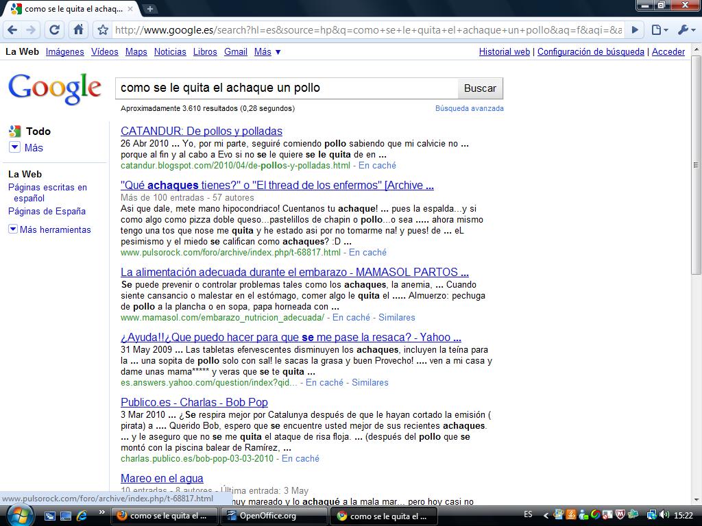 Pero repito, lo de ayer es demasiado surrealista. ¿No me creen? Hagan la prueba. Tecleen en el buscador de google (desde aquí mismo pueden hacerlo pues no odio a quien me odia) “como se le quita el achaque un pollo”. ¡Eso sí es una búsqueda absurda. Al menos debería decirnos que achaque tiene el pollo para poder ayudarle. Achaques hay muchos ¿reuma? ¿artrosis en la pata derecha? ¿afonía? ¿inapetencia sexual?…. Pero sin saberlo no podemos hacer nada.