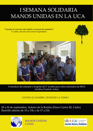 Han pasado 50 años desde la fundación de Manos Unidas. 50 años de trabajo desinteresado por los demás. De luchar por combatir las lacras que afectan a nuestro mundo. Años en los que los voluntarios de Manos Unidas lo han dado todo. Después de 50 años, el trabajo de Manos Unidas sigue siendo necesario, pero su existencia en signo de esperanza. Porque su existencia permite la colaboración entre el Norte y el Sur. Pero, sobre todo, porque Manos Unidas lleva a la esperanza a los beneficiarios de los proyectos realizados. Son ellos los verdaderos responsables y protagonistas de estos 50 años de historia. Porque de ellos, de sus sueños, de sus esperanzas de futuro, nacen nuestros proyectos. Es su fuerza de voluntad ante la adversidad la que mueve Manos Unidas. Pero también la solidaridad de los voluntarios locales. Esta I Semana Solidaria de Manos Unidas en la Universidad pretende ser un recordatorio de la necesidad de continuar con el trabajo. De seguir luchando por cambiar el mundo. De la obligación que tenemos todos de cuidar de nuestro mundo como forma de combatir el hambre.A lo largo de la semana, estará abierto el Rastrillo de Manos Unidas de 10 a 13h y de 17 a 21h. Cada día, a las 19’30h, habrá actuaciones y conferencias. Los beneficios obtenidos en esta I Semana se destinarán a la construcción de un comedor y una sala de juegos en un centro hospitalario para niños huérfanos afectados de SIDA, en la región de Andhra Pradesh (India). En el año 2002 el padre Jyothis fundó un hospital para atender a enfermos de SIDA. Ocho años después, 60 niños conviven en el centro junto a enfermos terminales. En una única sala duermen, comen y estudian al no poder acudir a las escuelas locales ante la incomprensión de las poblaciones vecinas. El pasado año solicitaron a Manos Unidas la ampliación de las instalaciones para dotar a los niños de comedor y sala de juegos. Un proyecto valorado en 10.000€ y que traerá una sonrisa a los niños y niñas que viven en el hospital.