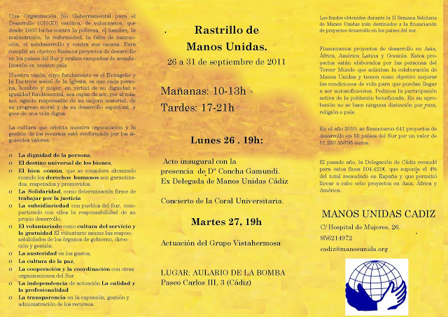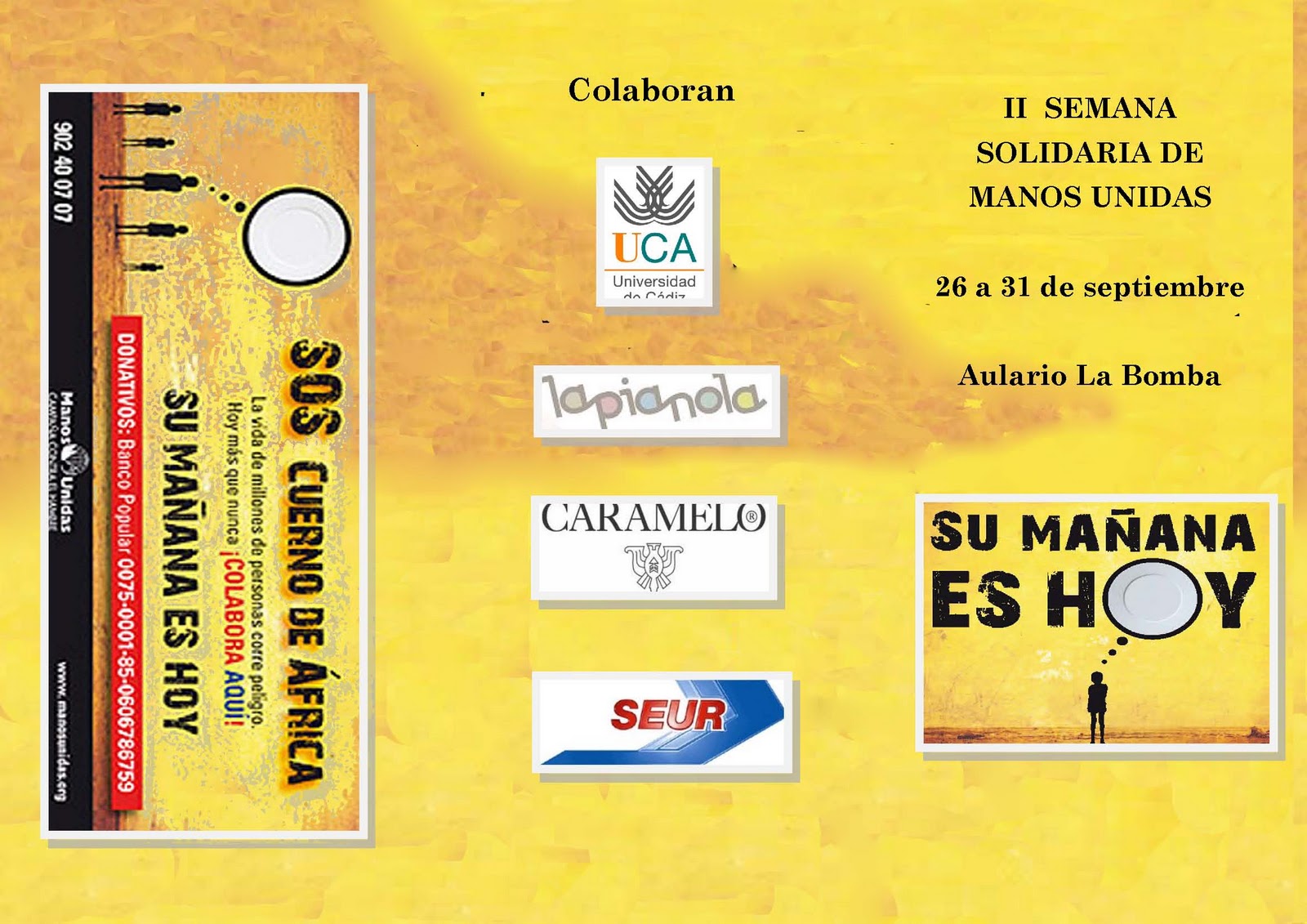 Desde esta tarde, y durente toda la semana, Manos Unidas Cádiz celebra su II Semana Solidaria que tendrá lugar en el aulario de La Bomba. El acto será inuaugurado con una conferencía sobre voluntariado pronunciada por Concha Gamundi, ex- Delegada en Cádiz de Manos Unidas, a las 19’30h y posteriormente habrá un concierto de la Coral Universitaria. Mañana seguirán los actos lúdicos con el concierto del Grupo Vistahermosa.