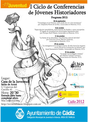 Este año Ubi Sunt? ofrece una nueva iniciativa y, de la mano de la Casa de la Juventud del Ayuntamiento de Cádiz, presenta un ciclo de conferencia de jóvenes investigadores, recuperando así el espíritu con el que vio la luz. Cinco conferencia de la mano de cinco historiadores que, aún menores de 30 años, tienen ya cierto camino recorrido en esto de hacer historia y, sobre todo, mucho más futuro. Personalmente intentaré acudir a varias de ellas, sobre todo a la de Alejandra Flores, gran historiadora y mejor amiga, si bien el trabajo puede ser un importante impedimento. A la que, por motivos obvios, no faltaré es a la de Enrique Ruiz, uno de los medievalistas con más proyección de los salidos de nuestra Universidad en los últimos años y cuya tesis doctoral estoy deseando leer.