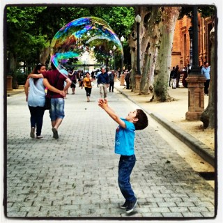 Juega el niño con su burbuja, disfrutando de cada color reflejado en la delgada barrera que la separa del nada. Juega ausente de problemas, incapaz de ver que ocurrirá cuando llegue a sus manos inocentes. Mirando a través de ella para ver distorsionado el mundo que le rodea, el que está fuera de la burbuja que desciende ante él. El que habitan sus padres, sus abuelos, el artista ambulante que ha creado la única obra de arte que quiere tener el niño.
