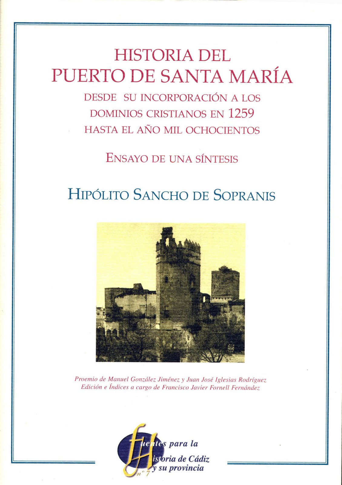 Desde su incorporación a los dominios cristianos en 1259 hasta el año mil ochocientos. Ensayo de una síntesis. El mérito de Sancho de Sopranis fue haber sido el primero en ilustrar los orígenes del Puerto de Santa María a partir de la riquísima información contenida en algunas de las hermosas cantigas de Alfonso X el Sabio. En el capítulo segundo, analiza la primera repoblación del Puerto, así como la carta – puebla otorgada por Alfonso X el 13 de diciembre de 1281. En el capítulo tercero, Sancho de Sopranis, vuelve a echar mano de las Cantigas para referir la predilección de Alfonso X hacia el Puerto de Santa María. En los capítulos IV y V se pasa revista a un breve etapa durante la cual el Puerto fue señorío de la Orden de Santa María de España (1272 – 1280). El capítulo VI se dedica con un gran lujo de detalles, a las relaciones entre Colón y el Puerto. Los cuatro últimos capítulos de la I Parte los dedica Sancho de Sopranis a la organización municipal y eclesiástica de la villa, para concluir con una reconstrucción de la vida y fisonomía de la villa en torno a 1498. A la Edad Moderna, Hipólito Sancho dedica los libros II, III y IV. El primero se centra en el siglo XVI, dentro de la que destaca su vinculación con el mundo atlántico. En el libro III aborda una dilatada etapa que tiene su comienzo en los albores del XVII y concluye en 1729. El libro IV, El Iluminismo, quizás el título menos afortunado tiene su inicio en la incorporación del Puerto a la Corona, coincidente con la estancia en la ciudad de la familia real de Felipe V, cuyos pormenores relata Sancho. No olvida Sancho en las páginas que dedica al siglo XVIII, efectuar un repaso a la vida religiosa de la ciudad. Parcas son en cambio las páginas dedicadas a la vida económica local, con las que remata la obra y que ofrecen un sumario testimonio de la roturación de alrededor de doscientas aranzadas de arenales para viñas, la ruina de las salinas y el desarrollo comercial. La síntesis de Hipólito Sancho se completa con unos nutridos apéndices dedicados a las magistraturas portuenses durante la Edad Moderna, que vienen acompañados de sendos índices onomástico y toponímico.